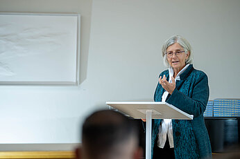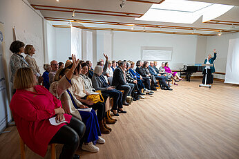So konnten auch die Ehrengäste, unter ihnen unsere SI-Deutschland-Präsidentin Manuela Nitsche, die Geschäftsführerin der Europäischen Metropolregion Nürnberg Dr. Christa Standecker, der Bürgermeister der Stadt Coburg Can Aydin und die Laudatorin Dr. Barbara Kahle nicht nur während ihrer Grußworte sichtbar sein. Alle acht am Preisverfahren beteiligten SI-Clubs regten durch zwischenzeitlich programmatisch platzierte Statements zum Nachdenken über die Brisanz der Kunstförderung von Frauen an. Aus der Mitte der 100 geladenen Gäste erschienen jeweils eine Clubschwester, stehend wie mahnende Säulen und trugen immer noch bedenkenswerte Tatsachen zur Situation von Künstlerinnen in unserer Gesellschaft vor: