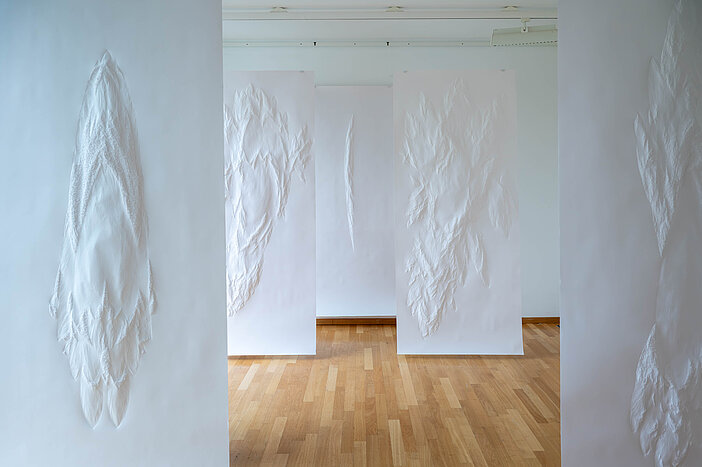 Mit ihren poetisch reliefierten klein- und großformatigen Arbeiten regt sie zum Schauen, Erkunden, Staunen, Befühlen und Nachdenken an. Man sitzt davor und kommt zur Ruhe oder man umkreist die Werke und besieht Vorder- und Rückseite, das Spiel mit Erhabenheit und Vertiefung, mit Licht und Schatten. Es ist zum Staunen und es reift die Erkenntnis: weiß ist nicht weiß. Aja von Loeper interagiert „nur“ mit weißem Papier und es ist unglaublich, welche Strukturen und Oberflächenveränderungen sie mit einem kleinen Holzkolben, Kraft, Mut, Geschick, Ausdauer und Erfahrung dem Papier abringt.